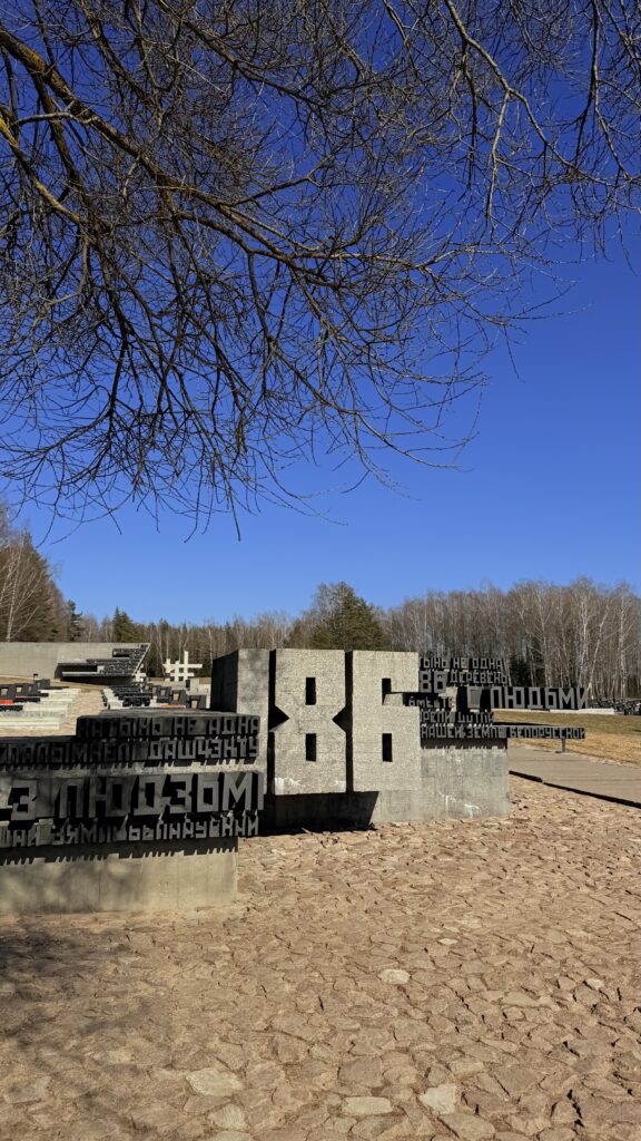 «Мы сгорели живыми в огне». 22 марта в Беларуси отдают дань памяти жертвам трагедии в Хатыни Деревню Хатынь уже не найти на картах Беларуси. Гитлеровцы сожгли ее вместе с 149 жителями, из которых 75 детей. Ни в чем не повинным людям фашисты вынесли смертный приговор. Из домов в деревне гитлеровцы выгнали стариков, детей, женщин и мужчин. Больных и немощных подталкивали прикладами. Всех согнали в сарай на окраине, в котором когда-то хранилось сено. Взрослые как могли успокаивали детей, но тревога с каждой минутой все сильнее охватывала их. Запертые внутри, они не знали, что творилось снаружи. В это время несколько солдат обкладывали стены сарая соломой, лили бензин и жгли спички. Деревянный сарай мгновенно загорелся. В дыму задыхались и плакали дети. Взрослые пытались спасти детей. Под напором десятков человеческих тел не выдержали и рухнули двери. В горевшей одежде, охваченные ужасом, люди бросились бежать, но тех, кто вырывался из пламени, фашисты хладнокровно расстреливали из автоматов и пулеметов. На месте деревни в память о погибших был создан мемориальный комплекс «Хатынь». Решение о строительстве мемориала было принято в 1966 году. Тематически хатынский мемориал состоит из нескольких частей, но имеет единое композиционное решение, которое повторяет планировку бывшей деревни. В центре — бронзовая скульптура «Непокоренный человек». Это символ человека, который восстал живым из огня, вынес оттуда тело мертвого мальчика и несет его через годы, произнося вечное проклятие фашизму, проклятие любому злу на Земле. Его прообразом послужил свидетель хатынской трагедии Иосиф Каминский, чудом оставшийся в живых. Он, обгоревший, израненный, выбрался из полыхающего огнем сарая и среди трупов односельчан нашел изувеченное тело своего сына. Рядом со скульптурой — сомкнутые гранитные плиты, напоминающие крышу сарая, в котором каратели сожгли жителей Хатыни. На братской могиле — мраморный венок памяти с символическим обращением погибших к живым с просьбой беречь мир и покой на Земле: «Люди добрые, помните: любили мы жизнь и Родину нашу, и вас, дорогие. Мы сгорели живыми в огне. Наша просьба ко всем: пусть скорбь и печаль обратятся в мужество ваше и силу, чтобы смогли вы утвердить навечно мир и покой на Земле. Чтобы отныне нигде и никогда в вихре пожаров жизнь не умирала!». С другой стороны венка — ответ живых погибшим: «Родные вы наши. Головы в скорби великой склонив, стоим перед вами. Вы не покорились фашистским убийцам в черные дни лихолетья. Вы приняли смерть, но пламя любви к Родине нашей советской вовек не погаснет. Память о вас в народе бессмертна, как вечна наша Земля и вечно яркое солнце над нею». Бывшая улица деревни выложена серыми, под цвет пепла, железобетонными плитами. В тех местах, где раньше были сельские дома, поставлено 26 символических бетонных нижних венцов срубов и столько же обелисков, напоминающих печные трубы, обожженные огнем. Перед каждым из сожженных домов установлена открытая калитка как символ гостеприимства жителей деревни. На трубах-обелисках — бронзовые таблички с именами тех, кто родился и жил в этом доме, а позже погиб в огненном плену. Обелиски увенчаны колоколами, которые печально звонят каждые 30 секунд, напоминая посетителям о произошедшей здесь трагедии. На территории комплекса находится единственное в мире 